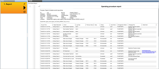 • You are in the Assisted Treatment window, and the operating procedure includes a report step that you must manually execute. For background information about the Desigo CC reporting feature, see the reference section.