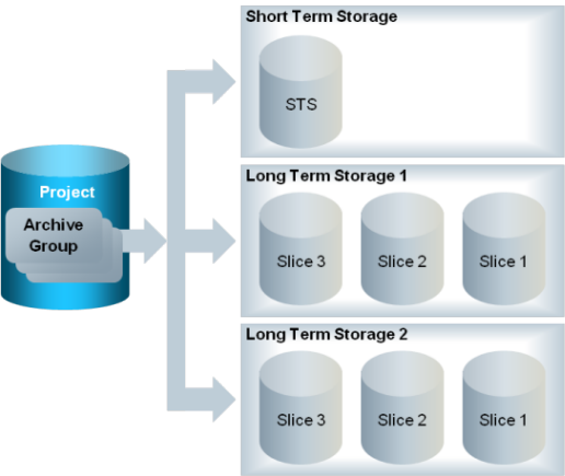 A project can have several archive groups. You can define settings for each archive group separately, whether the data is written to the Short Term Storage (STS) or the Long Term Storage (LTS) (see Configuring History Database in System Browser). Each LTS can have one or more LTS slices. You cannot edit or delete data in the LTS. You can only add data.