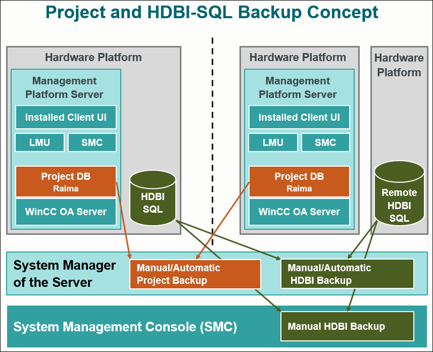You can initiate a backup of your project and HDB data from the Management Platform or from the SMC. Backups can be taken either manually or automatically.