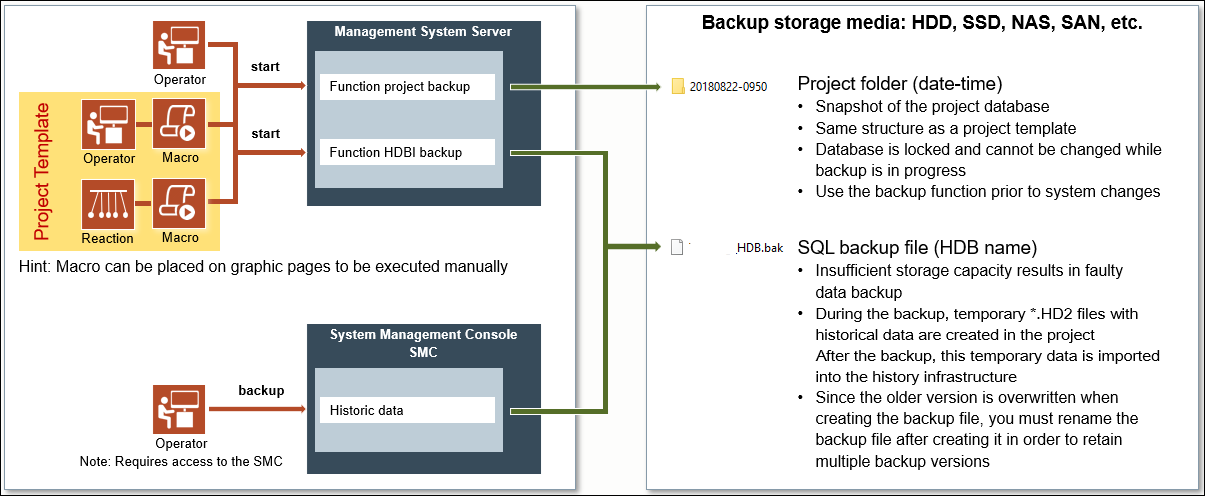 The HDB Backup saves all History Database data as well as all slices of the current Long Term Storage configuration. During the backup, temporary *.HD2 files are created in the project. After the backup, this temporary data is imported into the History infrastructure. The historic database can be backed up using Recovery Models.