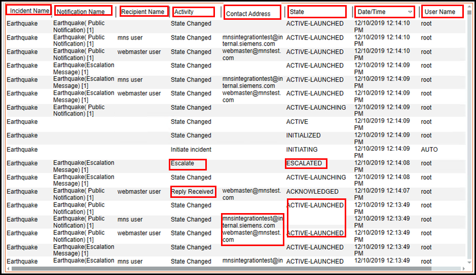• Date/Time: The date and time of the action performed as per the details mentioned in each row (for example, the reply from the recipient user was received on 2/11/2015 at 10:37:44 PM and the target message template (Earthquake(Escalation Message)) was escalated on 2/11/2015 at 10:37:44 PM.