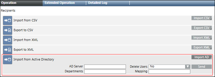 The Import from Active Directory property in the Operation tab allows the import of a department consisting of recipient users from an Active Directory.
