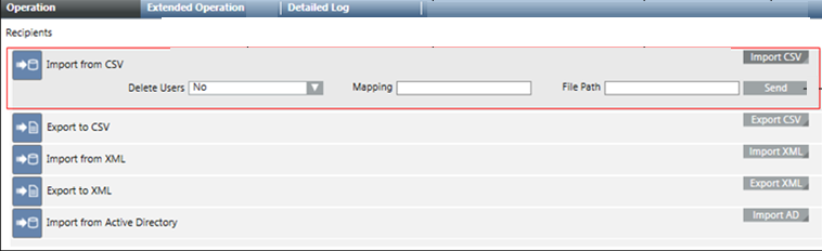 The Import tab allows the import of recipients from XML and CSV files and a department consisting of recipient users from an Active Directory.