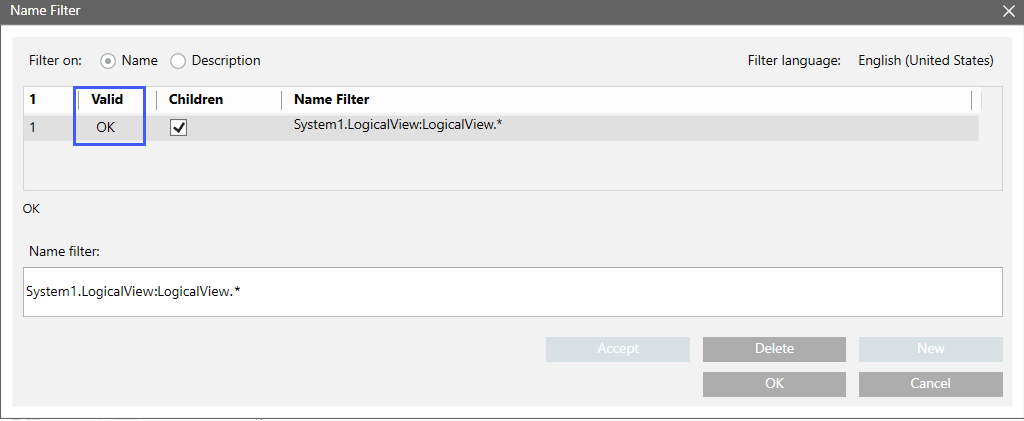 b. In the Name Filter dialog box, check the predefined path for validity and change as needed. In Valid column must showOK.