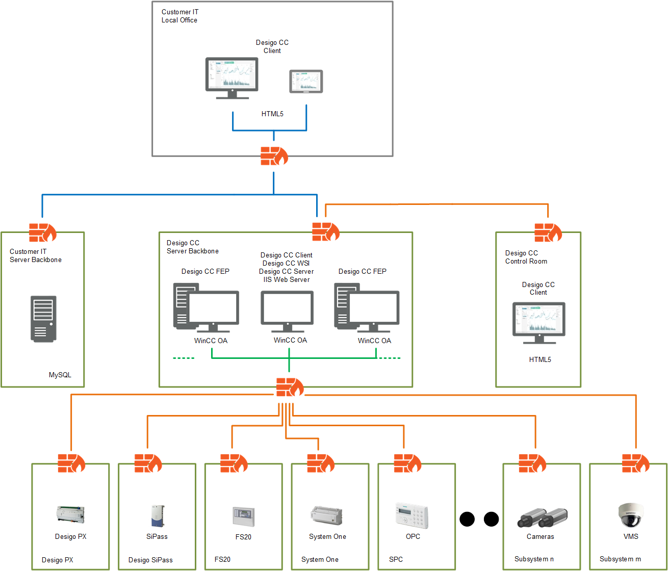 Internet web connectivity is not required, but a local web server is installed on the Desigo CC server computer for web-based clients to connect over a company's private intranet network. Communication between the key components can be secured by standard IT security mechanisms like certificates.