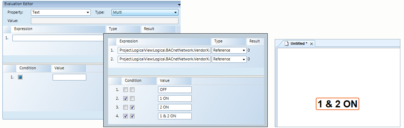 In the example above, both expressions 1 and 2 are True, as they have the same value. Therefore the fourth Condition/Value statement is applied and the text “1 & 2 ON” displays.