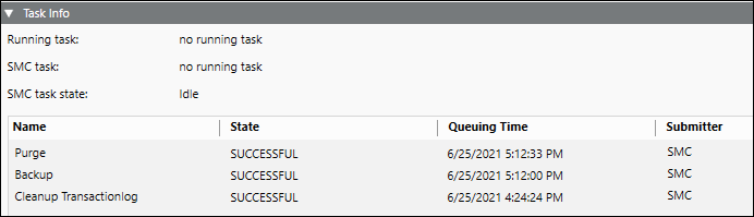 - SMC task: Displays the tasks started on the System Management Console, for example, Backup. The date of the last action is displayed to the right.