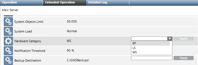 • The Extended Operation tab displays the various properties of the Main Server object, which also include those relating to the hardware category and system limits.