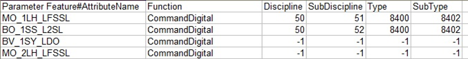 The first column of the first row contains the SiB-X section and the attribute used as key for the table. Its values are separated by the # character which is reserved and cannot be used in the section or attribute name. Each subsequent row contains the table data, where the Discipline, Subdiscipline, Type, and Subtype fields are indicated with their corresponding numeric value and -1 indicates object model value.