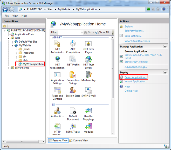 - Select Sites > [web application] that you want to export and click Export Application from the Actions pane.