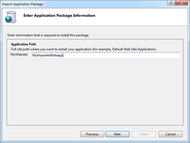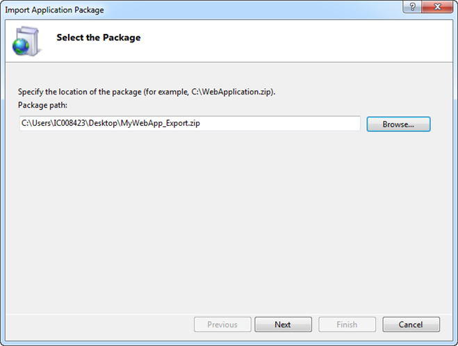 Select Sites > [website] and click ImportApplication from the Actions pane. NOTE: The Export Application menu displays only if you have installed Microsoft Web Deploy 3.6.