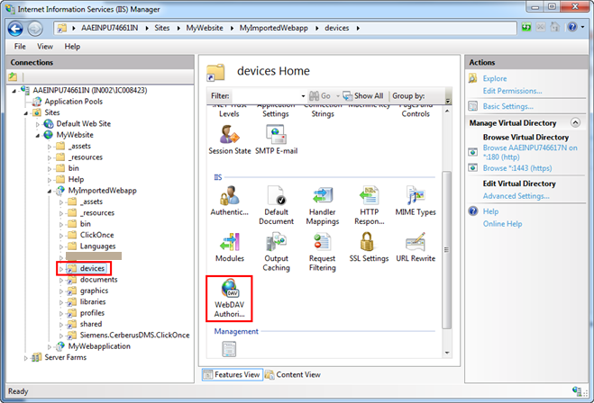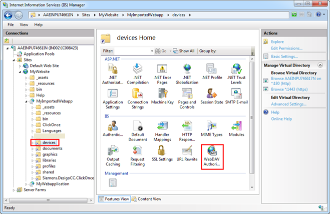 Select Sites > [website] > [web application] > [Virtual Directory] for which you want to enable the WebDAV Authoring Rules and double-click WebDAV Authoring Rules.
