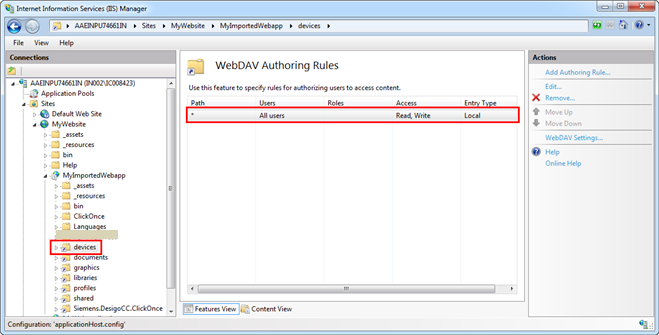The WebDAV Authoring Rule entries are added successfully for all the virtual directories, including ClickOnce.