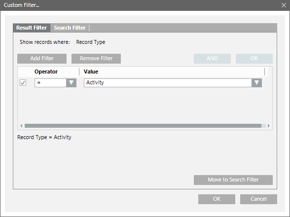 The Custom Filter dialog box allows you to define result and search filter expressions on a particular column. You can access this dialog box by either: