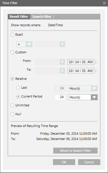 Displays the resulting time range for the options selected in the Time Filter dialog box. For example, if the present time is 08/07/2014 10.35 AM, then for the current 1 hour selection, the Preview of Resulting Time Range displays the following: