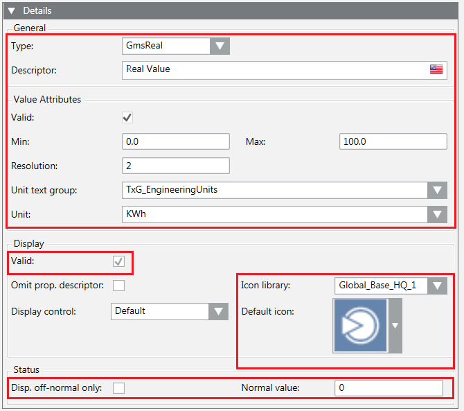 Properties | Optional | Object containing the valid range values and the resolution. For details, see Table GmsReal Properties, below. If the object is empty (“Properties”: { }), the values are reset: the range is |