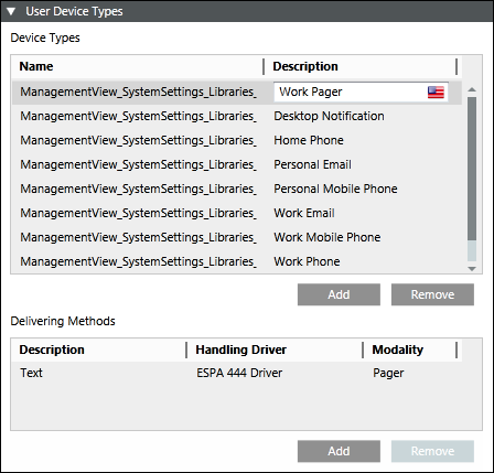 • The user device type is automatically configured. In the Recipient Editor tab, under the User Device Types expander, you can see that the ESPA 444 Driver is set as the handling driver and modality is set as Pager.