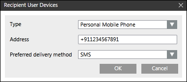1. In the Recipient User Devices dialog box, from the Type drop-down list, select Personal Mobile Phone or Work Mobile Phone as a recipient device for the corresponding recipient user.