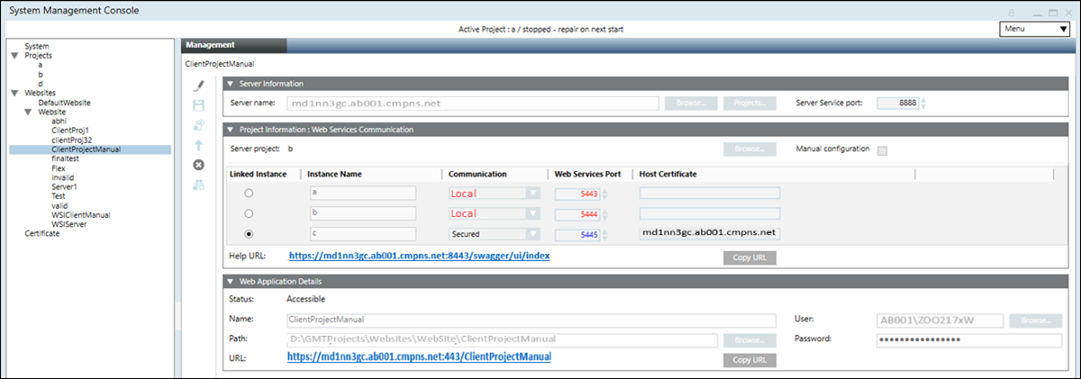 - In the Project Information: Web Services Communication expander, the Server project name is configured according to the selected Server project.