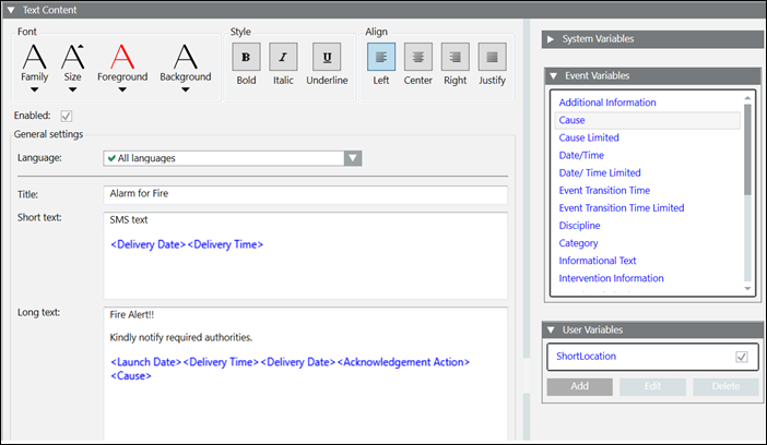 - System Variables: Displays the list of system variables. Except acknowledgment action variable, the system variables can be dragged to title, short text, and long text.