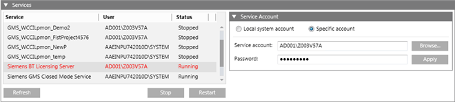 - From the Services expander, you can change the Service account user of a listed service except the project's Pmon service, GMS_WCCILpmon_[Project Name]. When needed, the Pmon service GMS_WCCILpmon_[Project Name], Service account user can be changed using System Accounts of the Settings expander.
