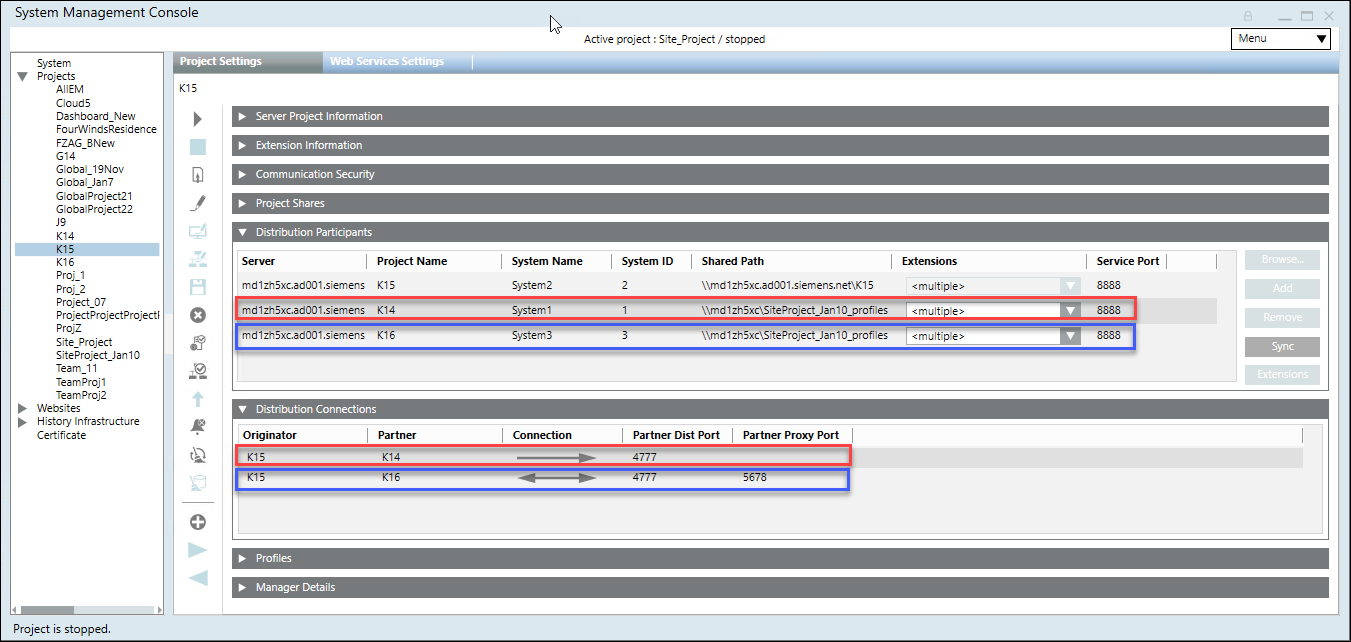 When you add the distribution partner project in automatic mode, the partner dist port and the partner proxy port values are automatically updated in the Distribution Connections expander. However, when you add the distribution partner project in manual mode, you must type in the correct partner proxy port number in the Distribution Connections expander for all the non-local linked secured distribution participant projects having the partner dist port configured. |