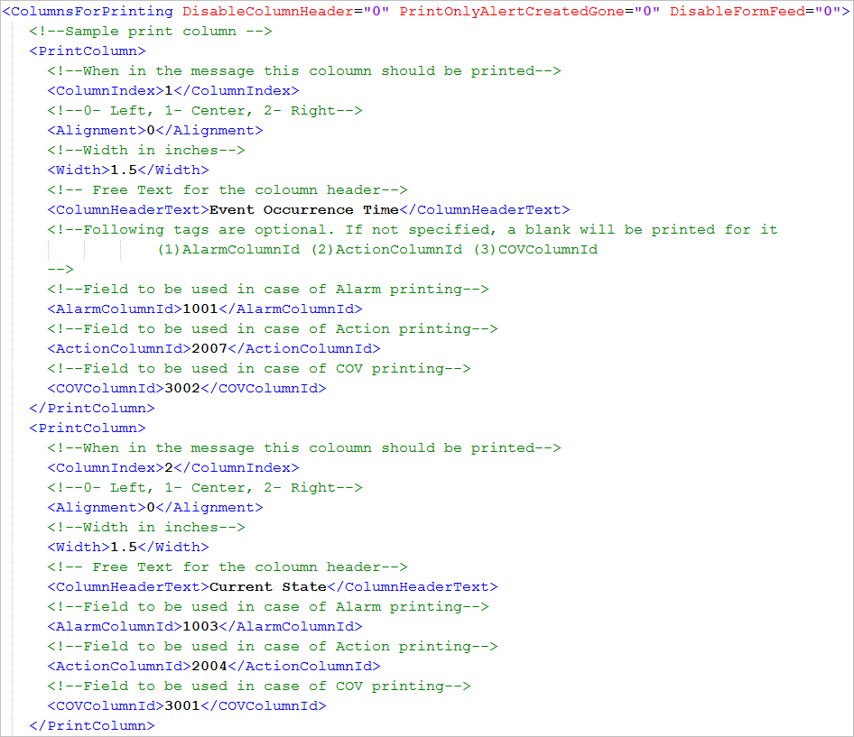- (Optional) In <ColumnsForPrinting>, specify PrintOnlyAlertGoneCreated = “1” to print all alert state printout except alert gone and alert created in the print out, and PrintOnlyAlertGoneCreated = “0” to print all alter state. The default is PrintOnlyAlertGoneCreated = “0”.