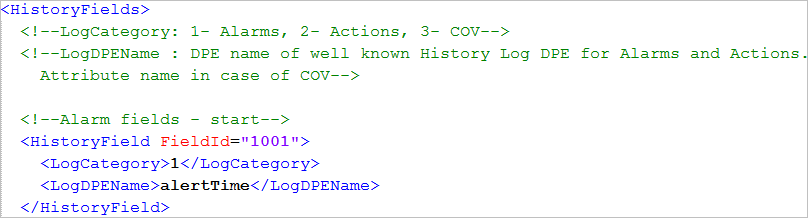 - The fields to be used in case of Alarms, Actions and COV, must be specified within the <AlarmColumnId>, <ActionColumnId>, or <COVColumnId> tags respectively.