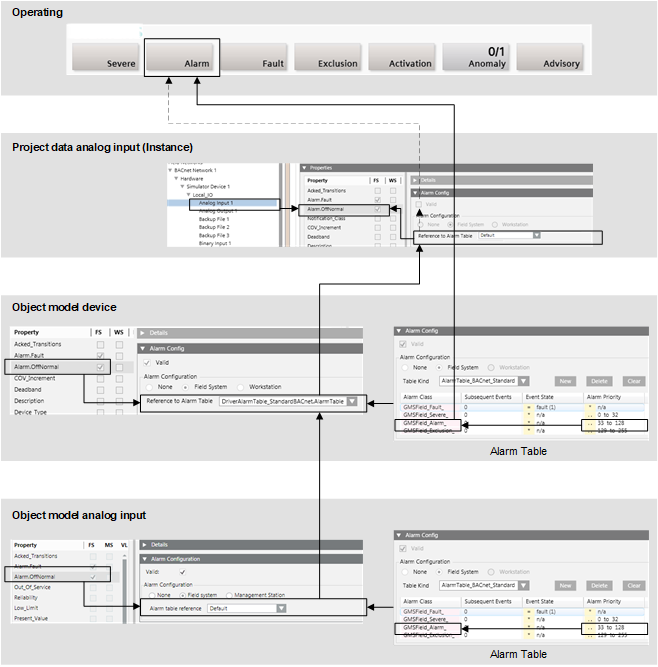 The field system alarm configurator connects the alarm event notification (from the automation station) to the associated alarm class such as Life Safety, Fault, Alarm, and so on.